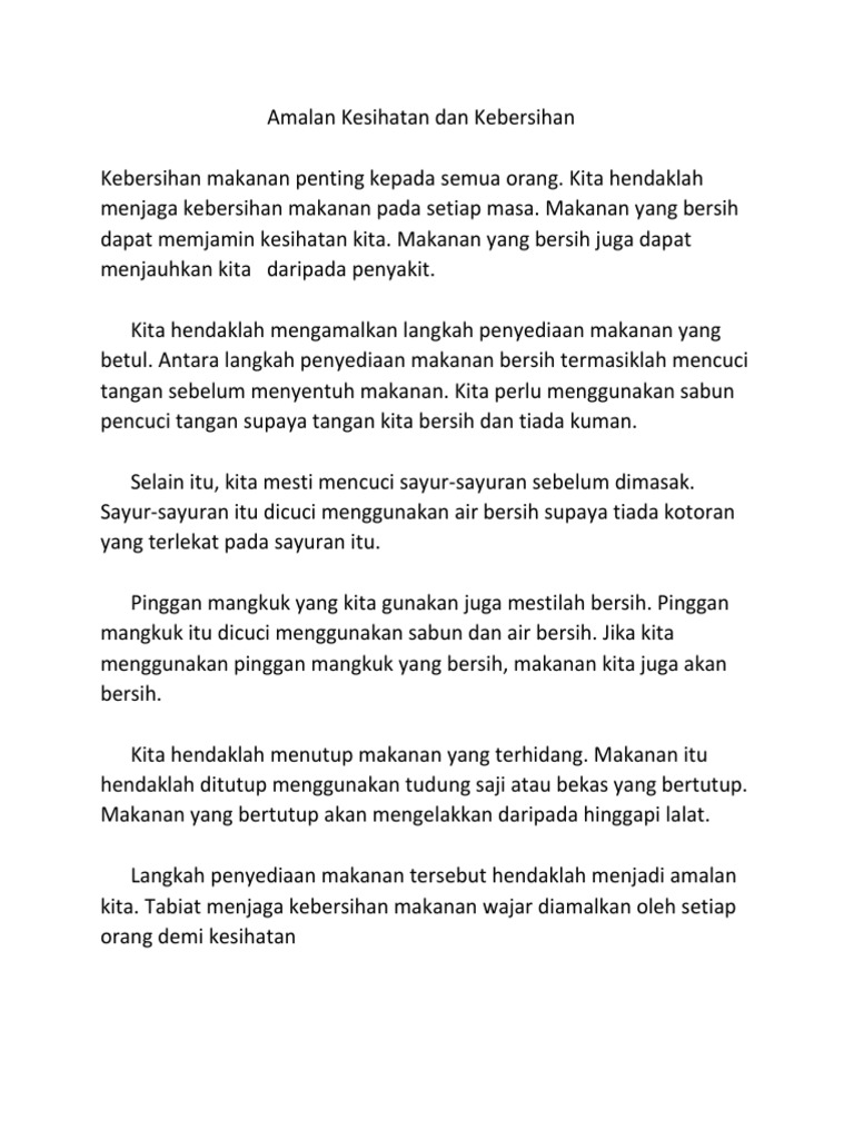Panjang karangan anda hendaklah antara 200 hingga 250 patah perkataan. Menjaga kebersihan diri dan persekitaran. Sebagai contohnya apabila seseorang itu memegang tombol pintu kemudian tanpa.